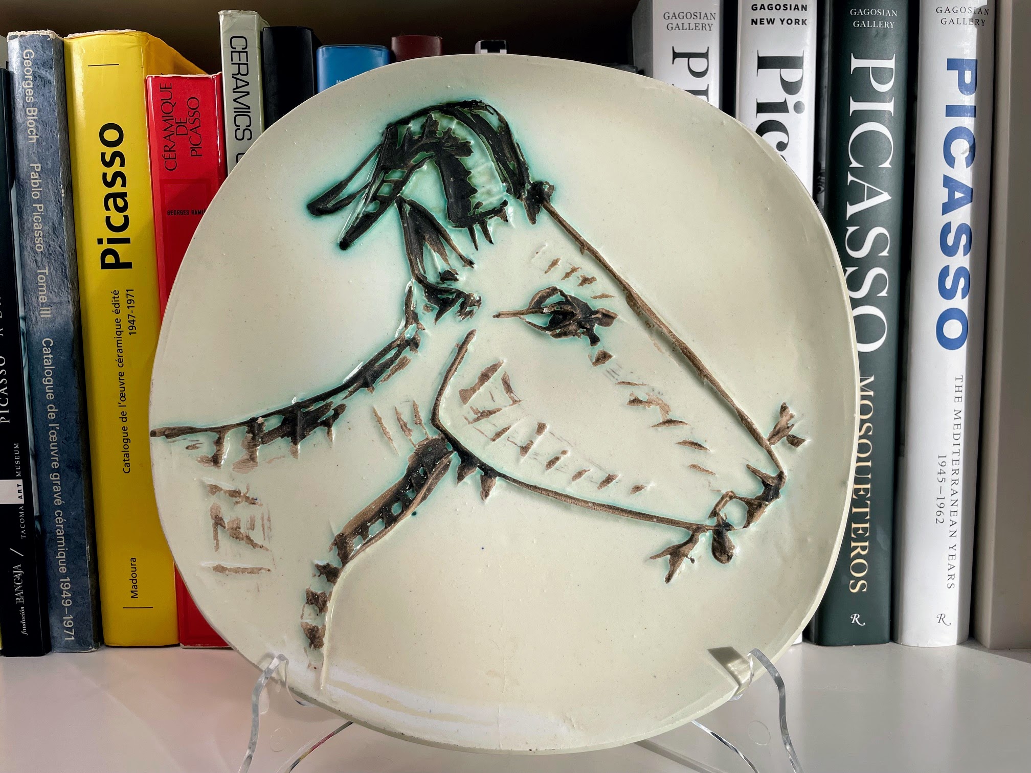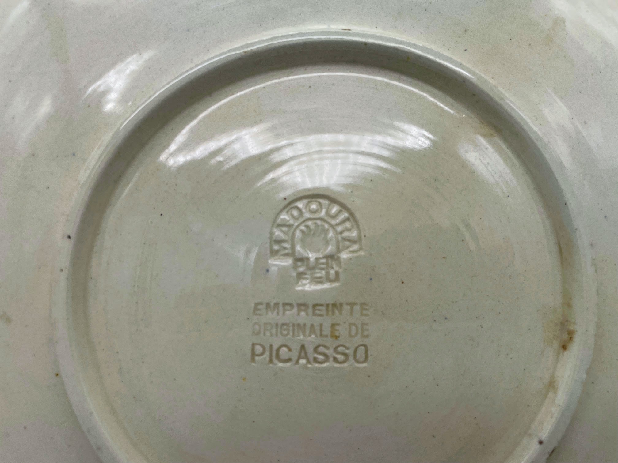 Produced in a limited edition of 60 pieces, each plate is numbered and stamped on the reverse with ‘Madoura Plein Feu’ and ‘Empreinte Originale de Picasso’, confirming its authenticity and origin from the famed Madoura studio. The fusion of functional ceramics with Picasso’s modernist approach to form and line makes this work a compelling blend of utility and artistic expression. It stands as a testament to Picasso’s creative breadth and his ability to bring dynamic life to even simple, everyday subjects in clay.